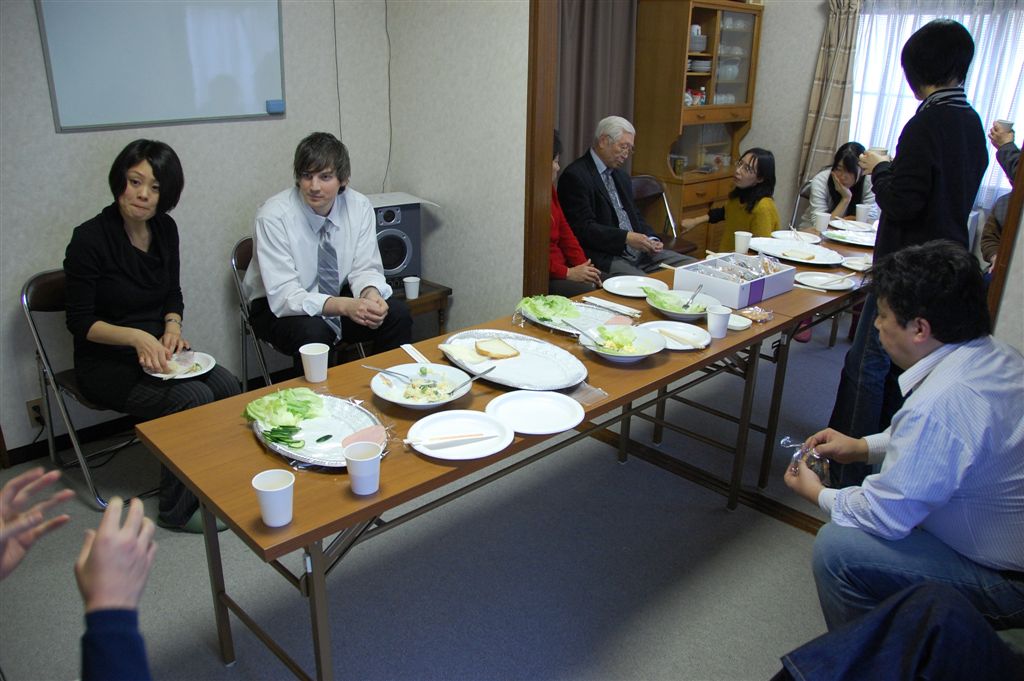 Last Sunday we visited Tsurumi Covenant Church in Yokohama. It is currently pastored by the director of the Covenant Seminary in Tokyo who is sitting to the left of Miho in the first photo and his wife standing behind him. The church was passed onto them from the previous seminary director and his wife. The greatest frustration that they have is that the necessity to reside on the seminary campus hinder them from being present in the local community and effectively evangelizing to them. The church is a two-story building where the upstairs is the sanctuary and the downstairs is the meeting space which used to be used as a parsonage.