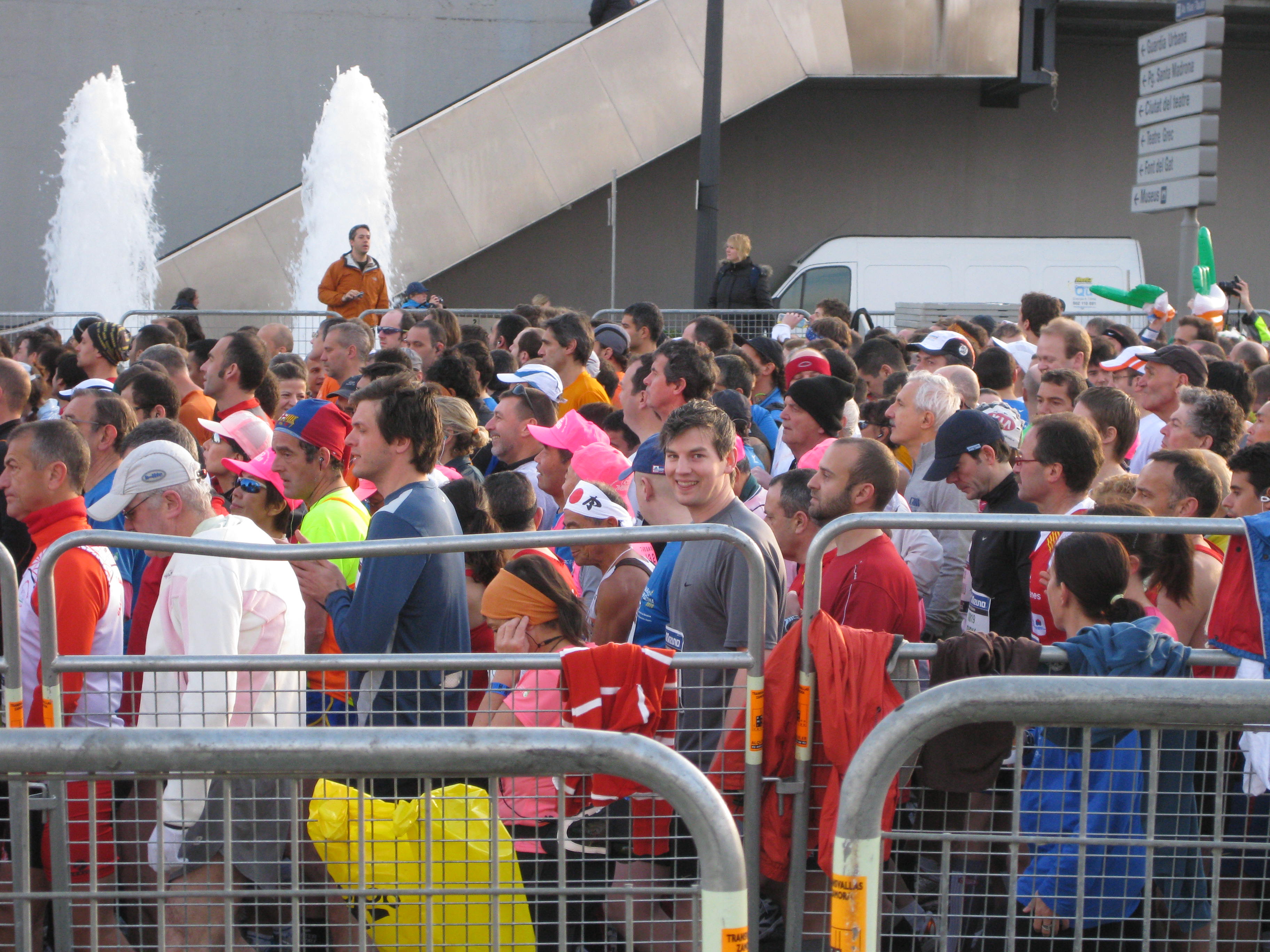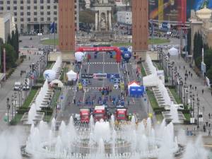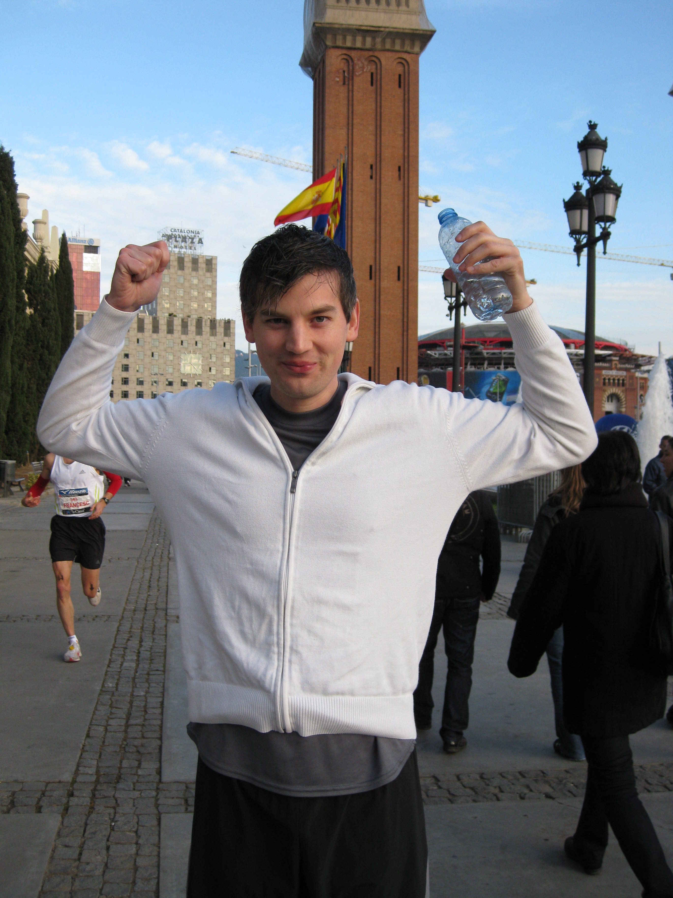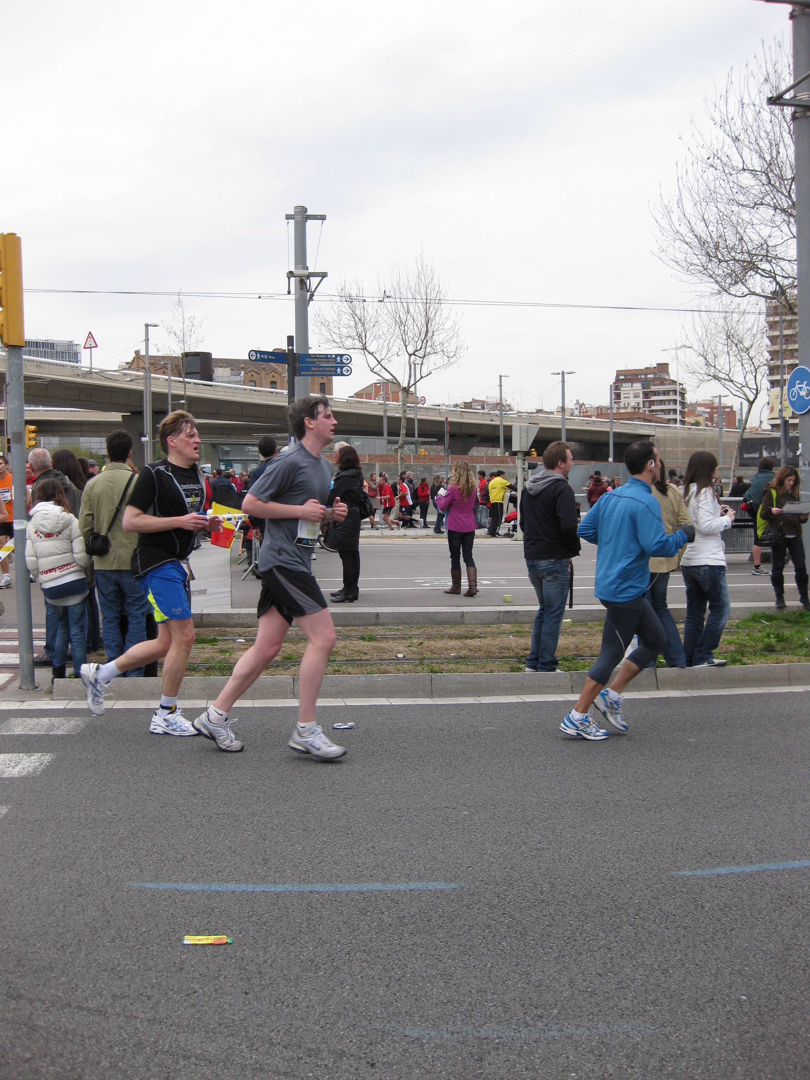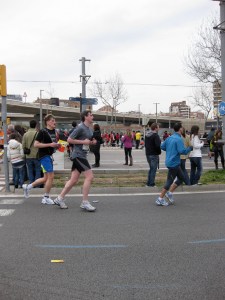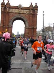 Joy and pain sum up this wonderful experience. After a strong start and completing the first half under my target time, the second half proved extremely challenging for me, partly due to a number of blisters on my toes. I ended up crossing the finish line at 4:10:59, though I hoped to complete it just under four hours. Barcelona was the most challenging course so far, with many inclines and slight hills. However, it might be the most beautiful architectural course to run. Starting just below the Palace and Magic Fountain (with the Olympic stadiums just behind), we passed the football stadium, the many amazing Gaudi buildings, the Sagrada Familia (cathedral), the Olympic Park with a Frank Gehry structure, the Arc de Triomphe, Cathedral, Columbus statue, the beach, and much more. Various groups performed throughout the course, with drumlines, rock bands, spanish guitarists, etc. There was a solid crowd along the way cheering for us, even a Japanese groups yelling “Gambatte” (Do your best!). Music playing on speakers was interesting, as certain stations blared Hannah Montana, The Killers, techno, “Achy Breaky Heart” by Billy Ray Cyrus, Nelly, and more. More than 12,000 people ran the race with me.