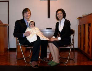 Yesterday, we dedicated Allie at our church here. A lady from the church is a wedding dress designer and created an incredible dress with matching cape and hood for Allie on this special occasion. Though Allie is typically fussy being held by other people, she was surprisingly calm as Pastor Sekino held her and prayed over her. Our next door neighbor (who has been coming to our Language Cafe) also came to the service! We wrote a special letter to Allie that we gave out to everyone who came to the service. Below is the letter (though part of it is in Japanese)…..